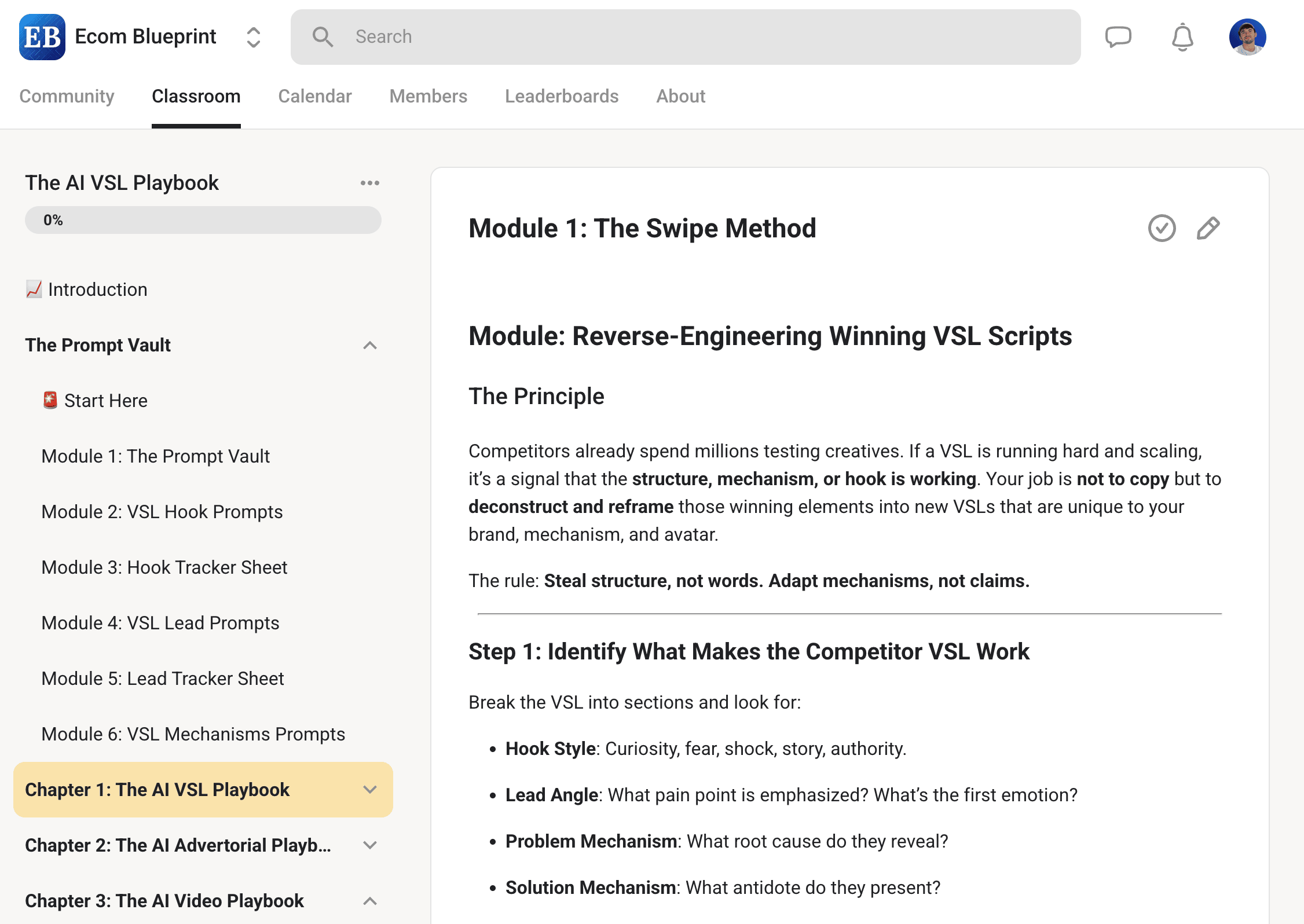 🚨 New Course Released! "The AI VSL Playbook" I've released a new course inside Ecom Blueprint outlining everything AI-related. This is how my team pumps out high-quality VSL scripts, hooks, and leads in minutes every week on autopilot with our AI workflows. The course includes detailed modules for using AI for the entire VSL creation process, from prompt templates for hooks and leads, prompts for breaking down scripts into structures, and generating 3D animations & AI avatars! Plugging these...